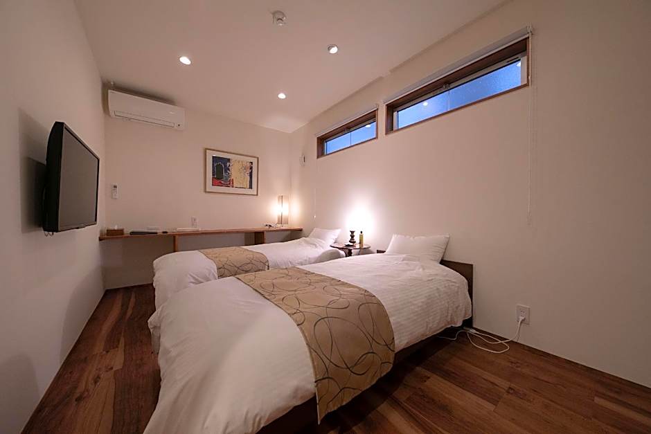 The quadruple room features air conditioning, tatami, as well as a shared bathroom boasting a bidet and a hairdryer. The unit has 4 futons.